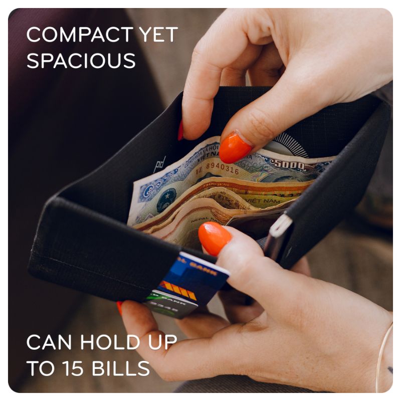 - Holds 2 passports*, 8 cards, and 15 unfolded cash bills
